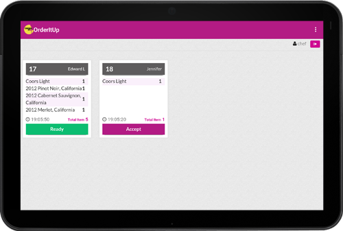 Augment your POS, add ordering anywhere, user pays as they go, tap 2 order Routes to bar/kitchen. Display screens show status for p/u. – NFC integrated